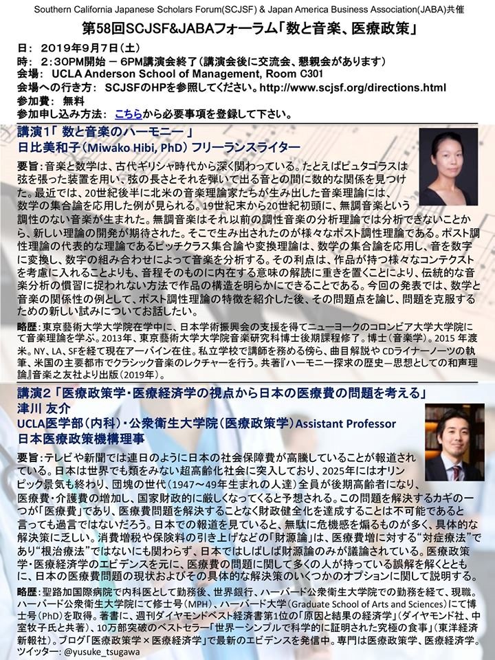[Lecture Report] “Considering the problem of Japan’s medical expenses from the perspective of health policy and health economics studies” (The 58th SCJSF & JABA Forum, September 7, 2019, UCLA, California, United State)
