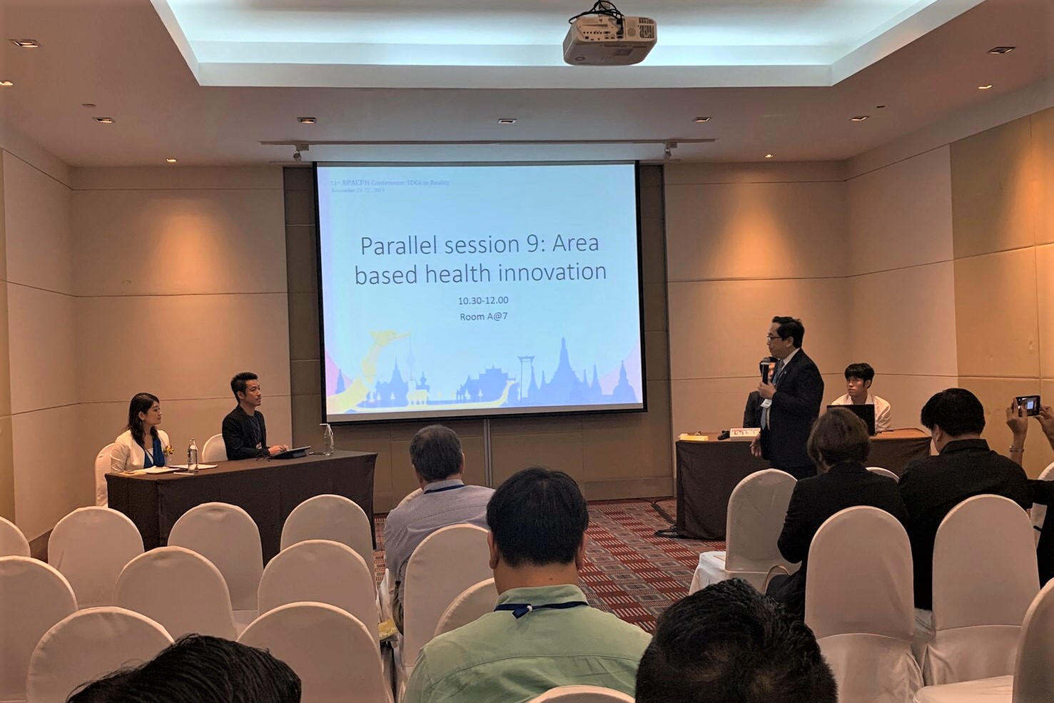 HGPI Manager Ms. Eri Yoshimura participated in the 51st Asia-Pacific Consortium for Public Health (APACPH) Conference: Sustainable Development Goals (SDGs) in Reality hosted by Mahidol University’s School of Public Health on November 21 and 22, 2019, in Bangkok, Thailand. There, she joined a panel session entitled “Area Based Innovation.”