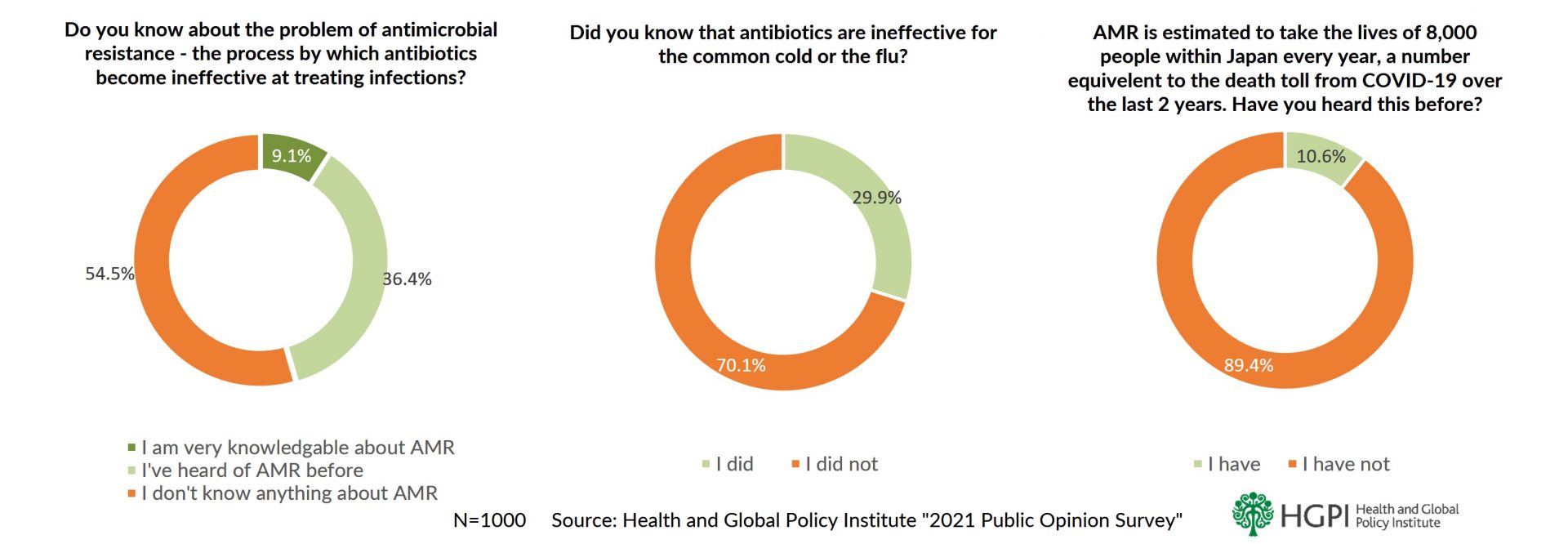 Results are in line with previous, similar research done by HGPI, and by Japan’s AMR Clinical Reference Center, respectively, which has shown that the number of people in Japan with at least some knowledge of AMR has been hovering around 40% for a number of years. It is clear that more still needs to be done to spread the word about the “silent pandemic” of AMR, a major public health and economic threat to Japan.