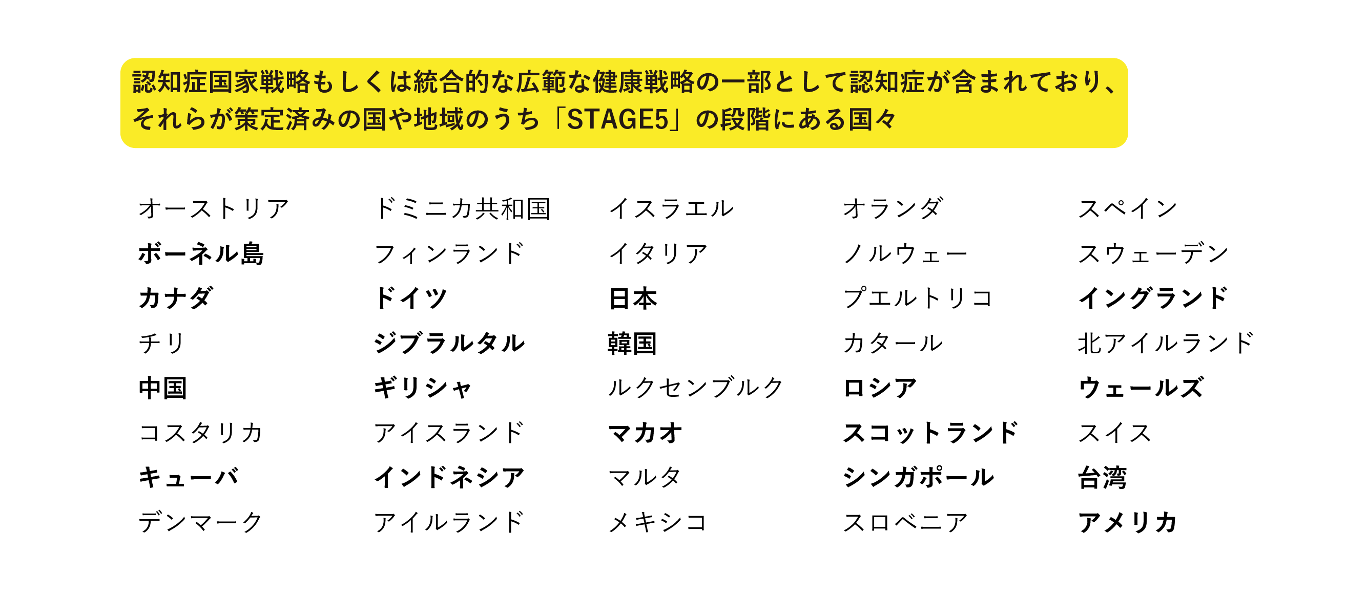 そして以下では、先ほどお示しした認知症国家戦略が策定済みの40の国と地域のうち、「STAGE5」の評価を受けている国を太字で表しています。昨年のレポートと比較すると、チリ、コスタリカ、フィンランド、アイスランド、アイルランド、マルタ、スコットランドが抜け、新たにボネール、カナダ、中国、ドイツ、ジブラルタル、ロシアが加わっています。つまり前年は「STAGE5」と評価されながら後退している国と地域が存在するということになります。こうした背景には、評価の見直しに加えて、COVID-19により財政的な手当てが難しくなったというケースもあるのではないかと考えられます。