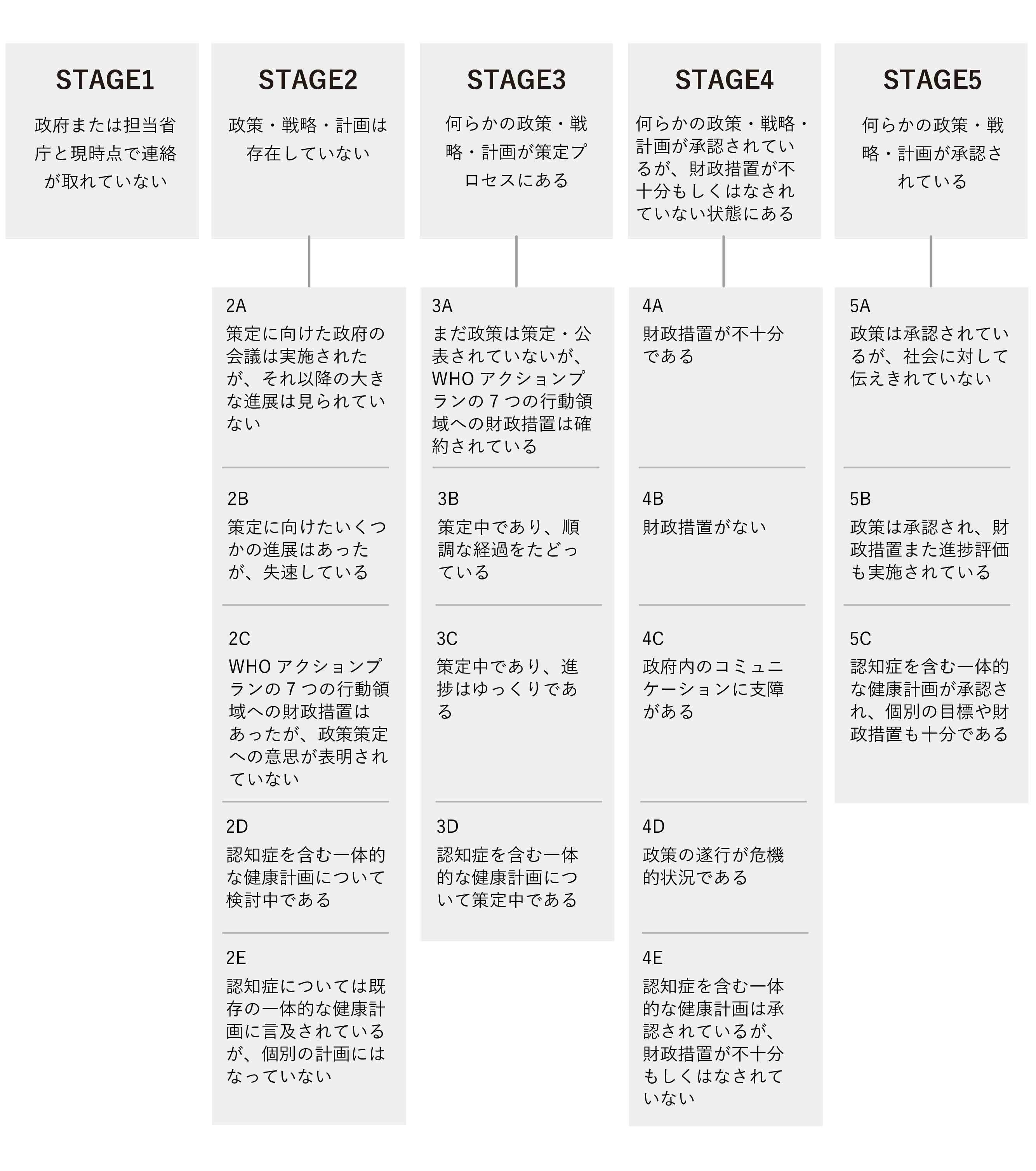 そしてこの評価指標に関して、私は1点訂正をしなくてはなりません。昨年のコラム(「国際社会の認知症政策の現在地」)では、各STAGEのアルファベットについて、より高次の評価であるような記述をしていましたが、これは決してSTAGE内でのランク付けの意図はなく、あくまでそのSTAGE内での状況をより詳細に表しているに過ぎないそうです。