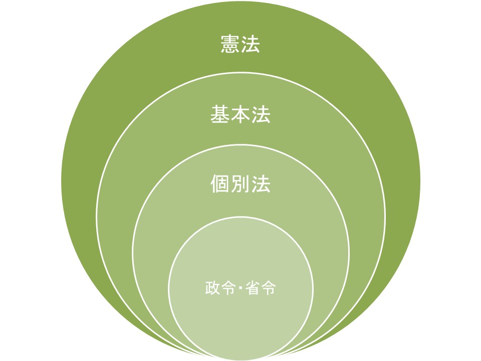 基本法は、国会で制定された法規範であり、その点に関しては個別法律と形式的な効力の差はありません。しかし、一般的に権利義務関係を規定する個別法律に対し、基本法は「『ものの考え方』が記載されており、基本法において記載されている内容が、立法府に対する立法指針、行政府に対する解釈・運用指針として作用するという政府の答弁も存在している」(山崎, 2010)法律です。このことから考えれば、一定程度、憲法―基本法―個別法律―政令・省令という関係性が成立し得ると言えます。さらに「基本法制定時には既存の個別法の調整や必要に応じて改正を行うこと、基本法制定後には、個別法の改正に際して基本法等の整合性に配慮することで、指針としての基本法の存在意義が発揮される」(川崎, 2006)との主張もあり、将来のみならず、既存の個別法に影響を与えることができると考えられます。また、基本法によって将来の立法の在り方に対する指針を示すという観点からも、基本法の制定によって、単なる政治的責任ではなく、法律上の義務付けによって拘束力を発揮できるというメリットがあると言えるでしょう。